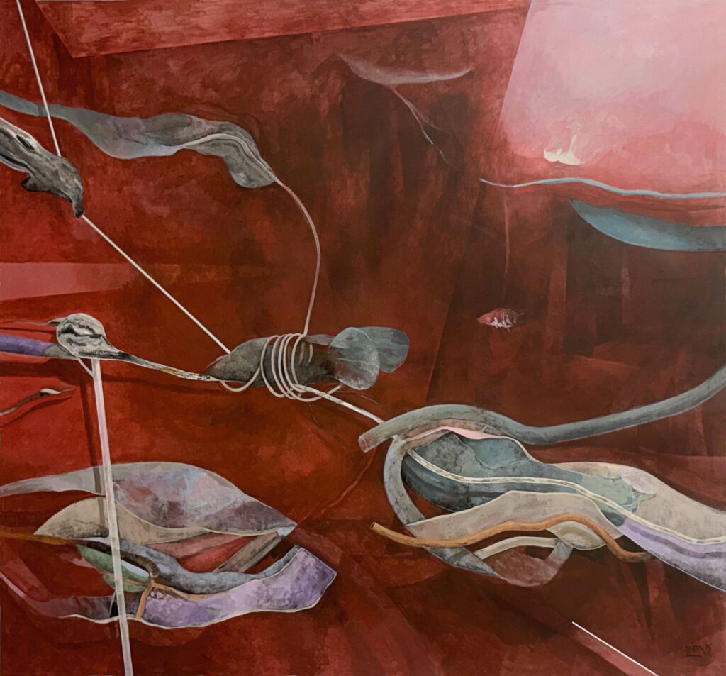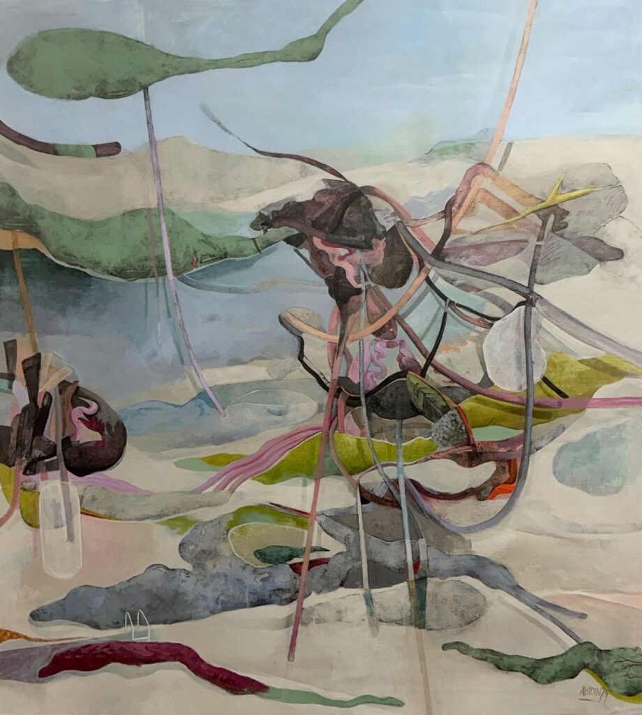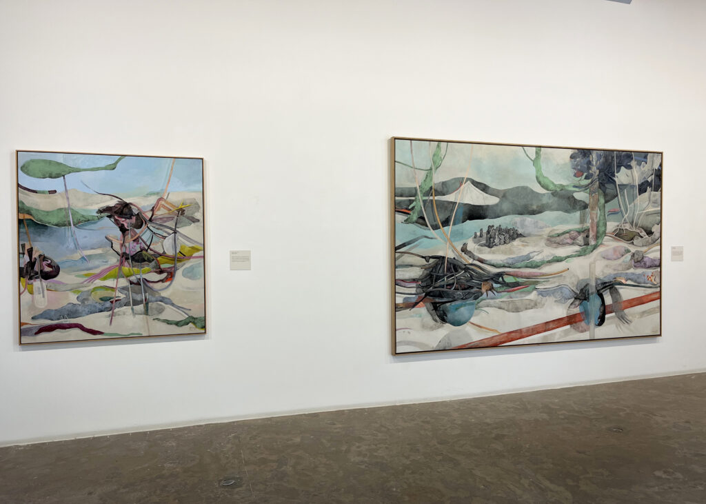 (Left) Adel Abidin, Above the Abyss, 2025, Acrylic on Canvas, 158 x 170 cm. (Right) Adel Abidin, Metamorphosis, 2025, Acrylic on Canvas, 131 x 145 cm.