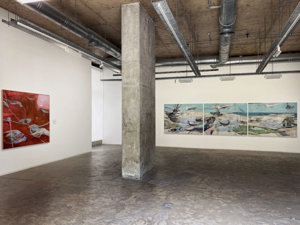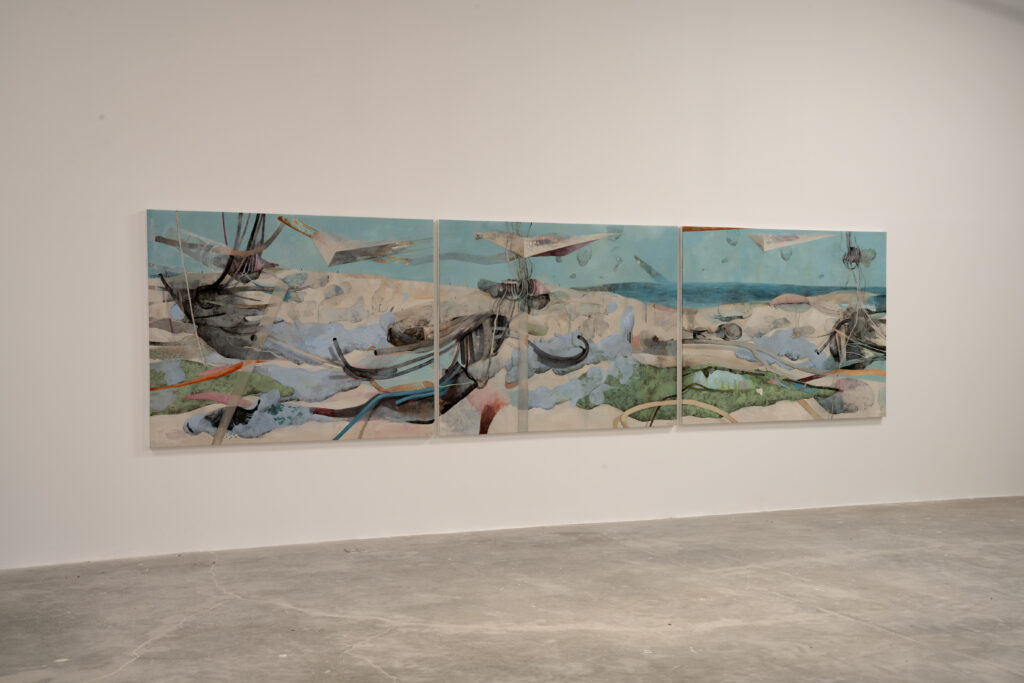 (Left) Adel Abidin, Drift (triptych), 2025, Acrylic on Canvas, 156 x 600 cm. (Right) Adel Abidin, Displaced, 2025, Acrylic on Canvas, 200 x 310 cm.