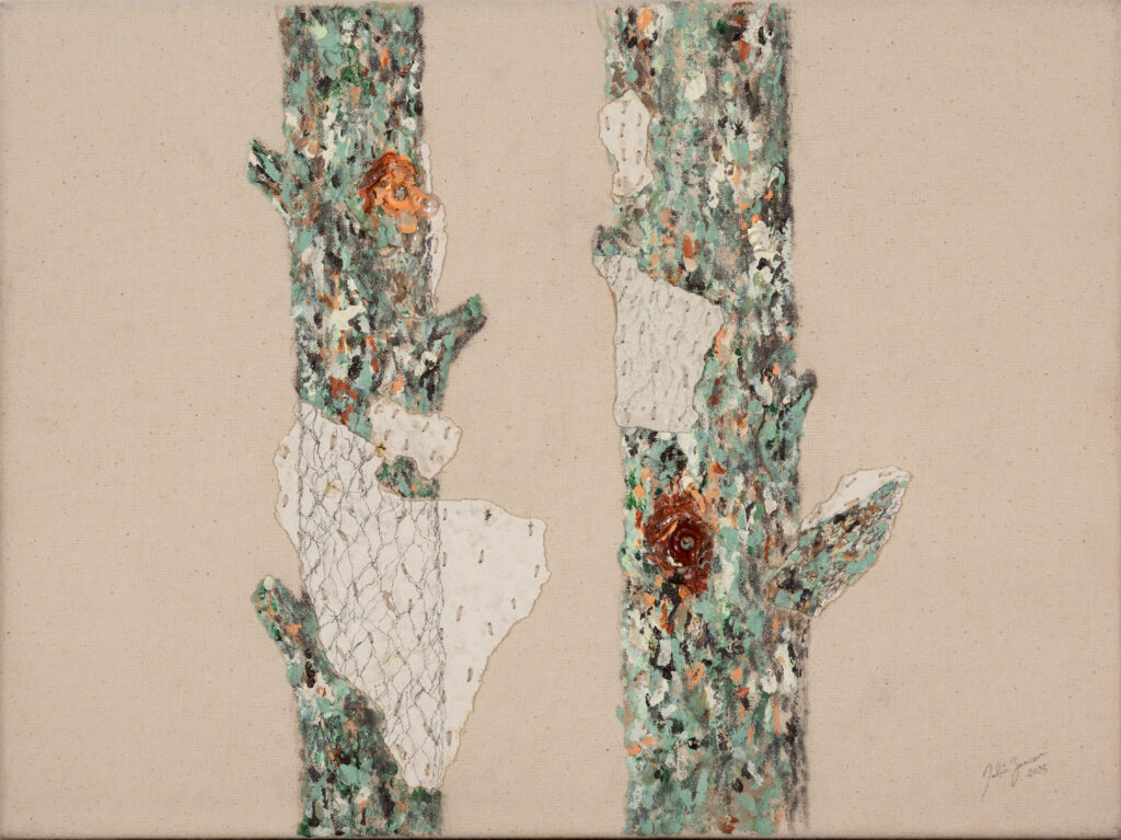 In The Harvest’s When the Season Returns XXXVIII (2025), fragments of wall paint salvaged from the Fayyad Building post-Beirut Port explosion are assembled with acrylic, graphite, printed fabric from very early works, threads and hot glue sticks – the textures recalling tree bark wounded yet in process of healing, simulating the resin trees emit when injured—a natural phenomenon of protection and rejuvenation. If XXXVIII speaks of rupture, When the Season Returns XXXIII (2025) gestures toward renewal, with the wall paints spreading like new skin across the bark’s fissures; it is an act of mending where scars are not concealed but integrated, becoming part of the ‘endurance landscape’. Through this body of work, Dalia raises questions: Is vulnerability contagious? Do we end up embodying the places we inhabit? Does daily life in a volatile environment like Lebanon make us inherently drawn to fragments and ruptures? Am I constructing a self-portrait through these clusters of broken pieces, or is this urge to preserve and merge a form of adaptation?”
