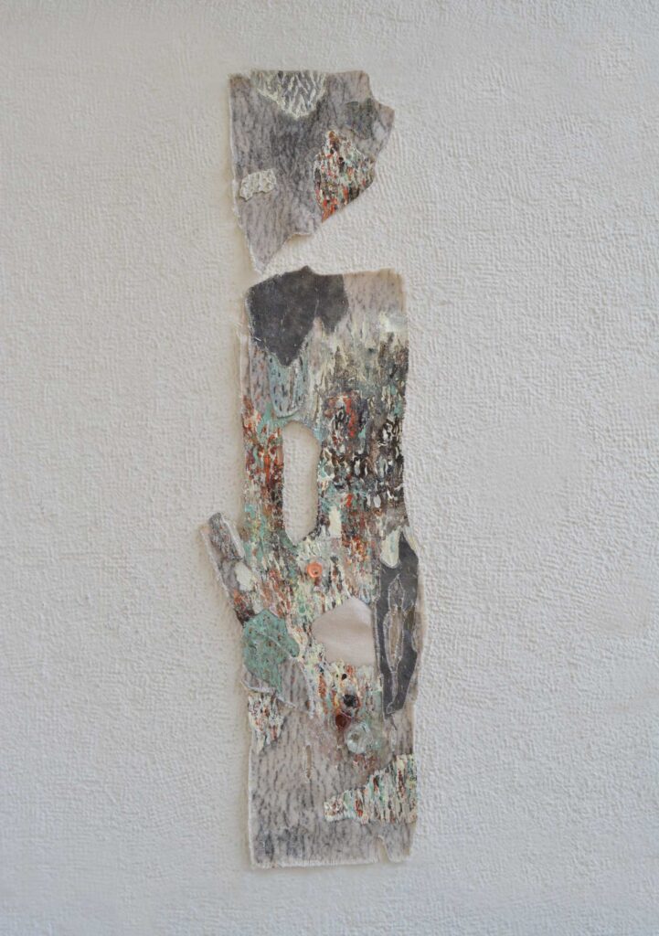 When the Season Returns XXXVIII, 2025, Wall paint collected from Fayyad Building (post-Beirut Explosion) graphite, threads, hot glue sticks, organza fabric, archival glue and varnish on canvas, 71 x 21 cm.