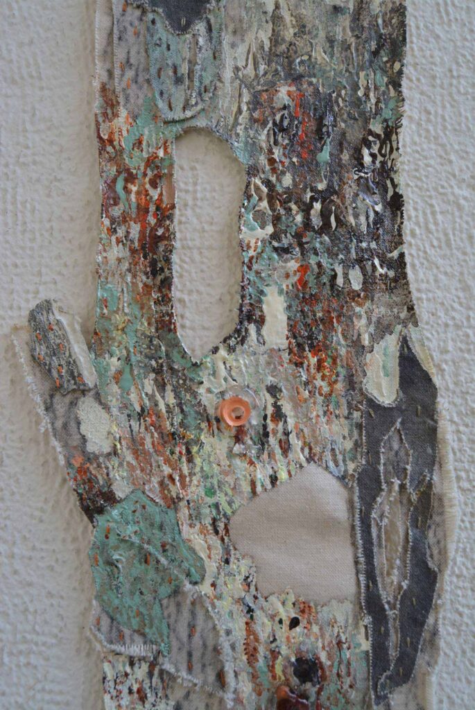 (DETAIL) When the Season Returns XXXVIII, 2025, Wall paint collected from Fayyad Building (post-Beirut Explosion) graphite, threads, hot glue sticks, organza fabric, archival glue and varnish on canvas, 71 x 21 cm.