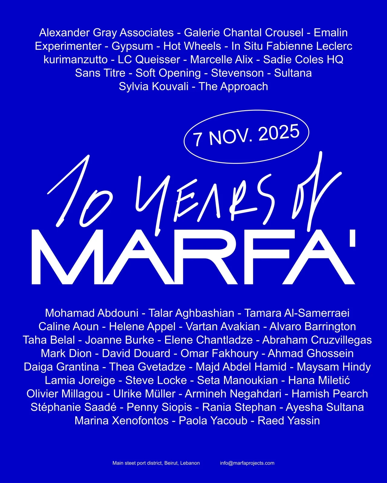 To mark its 10th anniversary, Marfa’ Projects invites eighteen galleries from around the world to participate in an exhibition at its Beirut location.