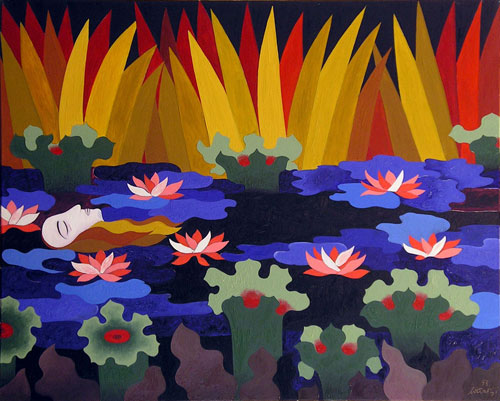 A self-described “naïve primitive”, Aractingi would likely shrug off such praise for what is, at its heart, simple and playful visual storytelling – and a view of the world to match. Though self-taught, his art nods to greats like Henri Rousseau and Paul Gauguin. His paintings are mostly oil or acrylic on canvas, always potent in color and candor. Like Rousseau, Aractingi’s nature is imaginative rather than observed. Like Gauguin, his figures are stylized, flat, and symbolic. But his voice is unmistakably his own: more intimate, more absurd, less complex, and often, very personal. That’s because he has always folded into his works motifs from Egyptian folktales, Beirut street life, and the mythical stories of Antar and Abla, weaving East and West.